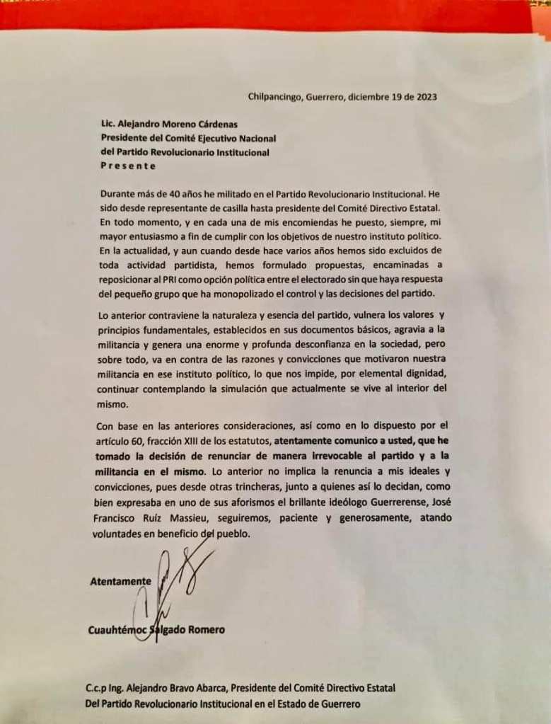 Este día circula la carta de renuncia al PRI del ex dirigente estatal de este partido, Cuauhtémoc Salgado Romero.