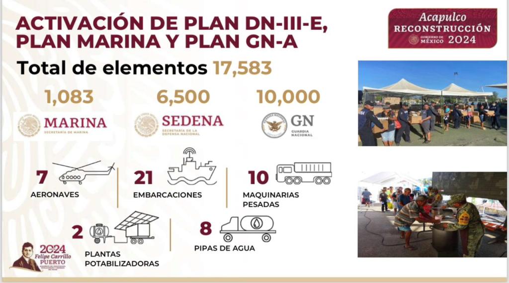 En el informe presentado esta mañana, se dio cuenta de la aplicación del Plan Marina, Plan DNIII-E y Plan de la Guardia Nacional, con la participación de 17 mil 583 elementos, se han puesto en marcha acciones de seguridad, distribución de alimentos, agua potable y asistencia médica, entre otras.