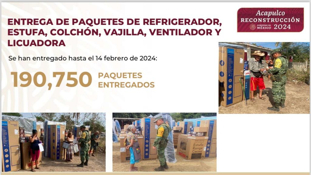 En cuestión de apoyos, se informó que, hasta el 14 de febrero, se han entregado 190 mil 750 paquetes de enseres, que incluyen refrigerador, estufa, colchón, ventilador, licuadora y vajilla, quedando pendientes por entregar 59 mil 250. Cabe destacar que para el traslado de los enseres que se adquirieron en China, se dispuso de un operativo marítimo especial.