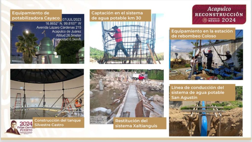 La Comisión Nacional del Agua (Conagua) aplica un total de 58 acciones (55 en Acapulco y 3 en Coyuca), con una inversión de 667.96 millones de pesos, para agua potable y saneamiento. Para ello se han realizado acciones como detección y reparación de fugas, captaciones, líneas de conducción e interconexiones, construcción y rehabilitación de tanques de almacenamiento, atención a estaciones de rebombeo, plantas potabilizadoras y colectores. Adicional a ello, se llevó a cabo la limpieza y desazolve de arroyos.