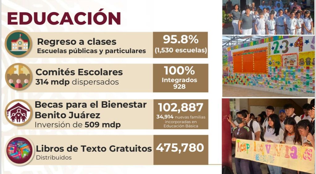 En lo que respecta a educación, el 95.8 por ciento de las escuelas públicas y privadas regresaron a clases, lo que representa un total de mil 530 instituciones educativas que se encuentran laborando. Hay 960 escuelas de educación básica reconstruidas.