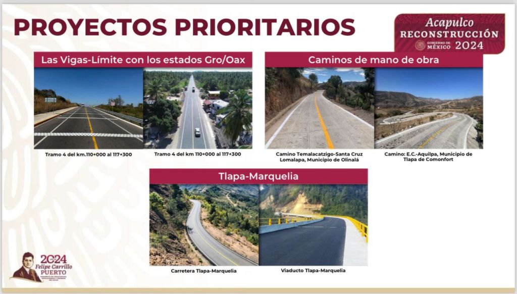 En materia de conectividad, se informó que la reconstrucción del Aeropuerto Internacional de Acapulco tiene un avance del 80 por ciento y se encuentra en operatividad; a partir de mayo se iniciará con vuelos internacionales hacia Dallas y Houston. Además, se encuentran en desarrollo siete proyectos carreteros, con inversión de 281 millones de pesos, como la ampliación de la carretera que conecta a Guerrero con Oaxaca, la reconstrucción de Puente Federal Ing. Alfredo Mendizábal en la localidad del Kilómetro 21, Construcción de Trinchera en Texca, Reconstrucción de Vialidades Urbanas, Rehabilitación de 12 kilómetros en carretera Pie de la Cuesta-Bajos del Ejido, Estabilización de Deslave en la Av. Escénica, entre otras acciones.