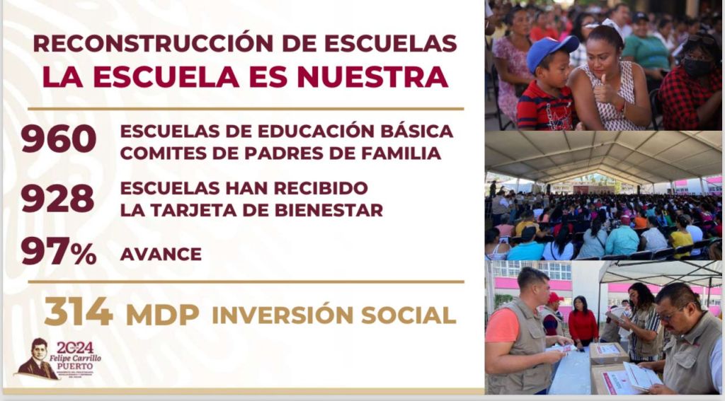La inversión social, representa una aplicación de recursos por el orden de los 15 mil 275 millones de pesos, destinados a 301 mil 076 beneficiarios del apoyo de limpieza y 614 mil 891 beneficiarios del apoyo de reconstrucción para hogares y pequeños comercios. Además, se mantiene la atención en Módulos de Bienestar, verificación de la reconstrucción, instalación de Comités de la Escuela es Nuestra, registro de créditos a la palabra, así como limpieza de escuelas y de calles.