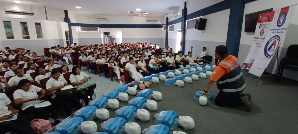 Acapulco, Gro., 22 de febrero de 2024.- Con el propósito de fortalecer la cultura de la prevención y promover los protocolos preventivos entre todos los sectores de la población, la Secretaría de Gestión Integral de Riesgos y Protección Civil impartió el Curso-Taller: “Reanimación Cardiopulmonar Básico” (RCP), dirigido a más de 480 estudiantes de la UAGro Universidad Autónoma de Guerrero en el Puerto de Acapulco.
