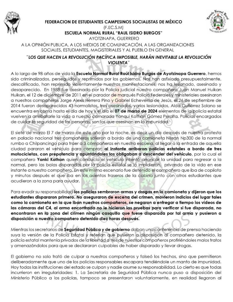 Después de realizar un recuento de lo que han sufrido durante 98 años que tiene la Normal Rural “Raúl Isidro Burgos” de Ayotzinaoa, hicieron hincapié de los hechos suscitados el pasado 7 de marzo de presente año, donde fue asesinado a manos de la policía del estado, uno de sus compañeros, Yanqui Khotan Gómez Morales, señalan que las autoridades incurrieron en graves faltas de protocolos de actuación, tratando de incriminar a sus compañeros para tapar sus males actuaciones en contra de los estudiantes.