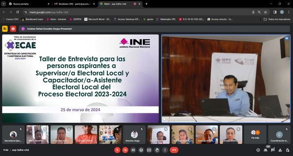La capacitación titulada «Aplicación de la entrevista para la selección de Supervisores/as Electorales y Capacitadores/as Asistentes Electorales Locales», fue impartida por el Vocal de Capacitación Electoral y Educación Cívica de la Junta Local Ejecutiva del INE Guerrero, Esteban Rafael González Vargas, como parte de las acciones del procedimiento de reclutamiento, selección y contratación de estas figuras.