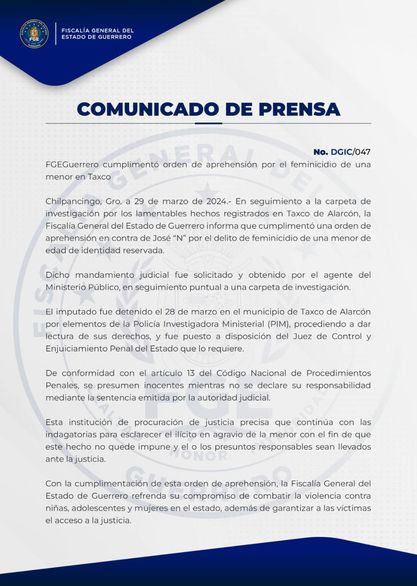 Chilpancingo, Gro. a 29 de marzo de 2024.- En seguimiento a la carpeta de investigación por los lamentables hechos registrados en Taxco de Alarcón, la Fiscalía General del Estado de Guerrero informa que cumplimentó una orden de aprehensión en contra de José “N” por el delito de feminicidio de una menor de edad de identidad reservada.