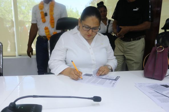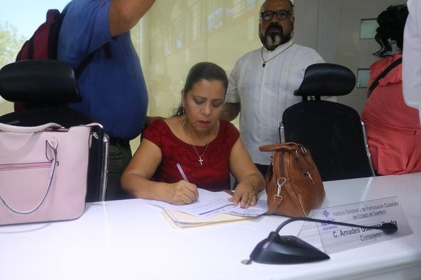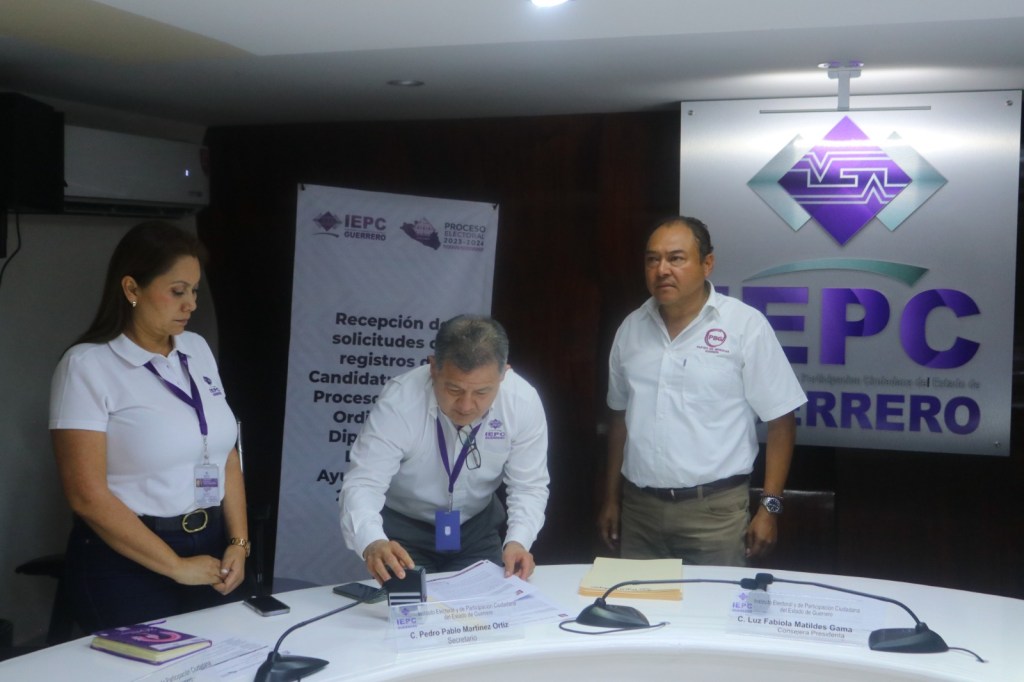 La Consejera Presidenta, Luz Fabiola Matildes Gama y el Secretario Ejecutivo, Pedro Pablo Martínez Ortiz, recibieron la solicitud de registro de candidaturas a integrantes de Ayuntamientos del Partido de la Sustentabilidad Guerrerense; con el acompañamiento de las Consejeras Electorales Cinthya Citlali Díaz Fuentes, Vicenta Molina Revuelta y Dulce Merary Villalobos Tlatempa, así como los Consejeros Electorales Edmar León García y Amadeo Guerrero Onofre.