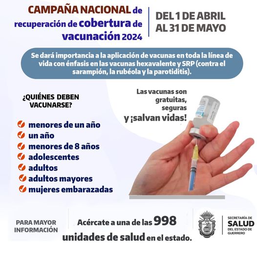 La Secretaría de Salud del Estado de Guerrero, informa que la Campaña nacional de Vacunación Universal sigue en marcha, desde recién nacidos hasta adultos mayores, todos pueden participar.