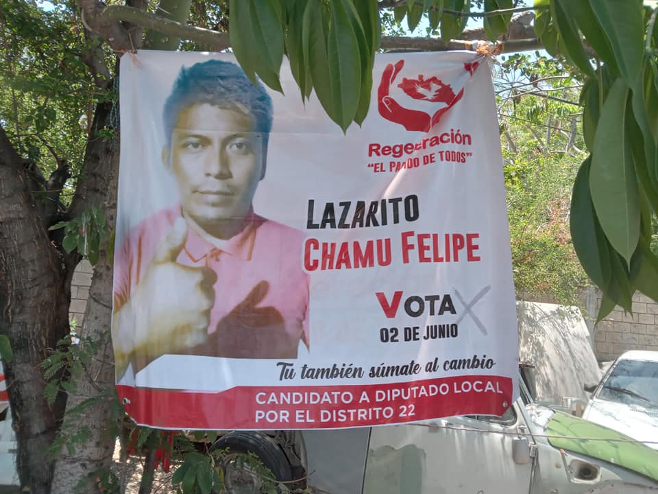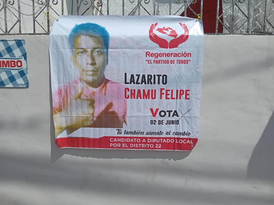 “Este 2 de junio vota por LAZARITO CHAMU FELIPE candidato a diputado local por el Partido Regeneración”. Concreta.