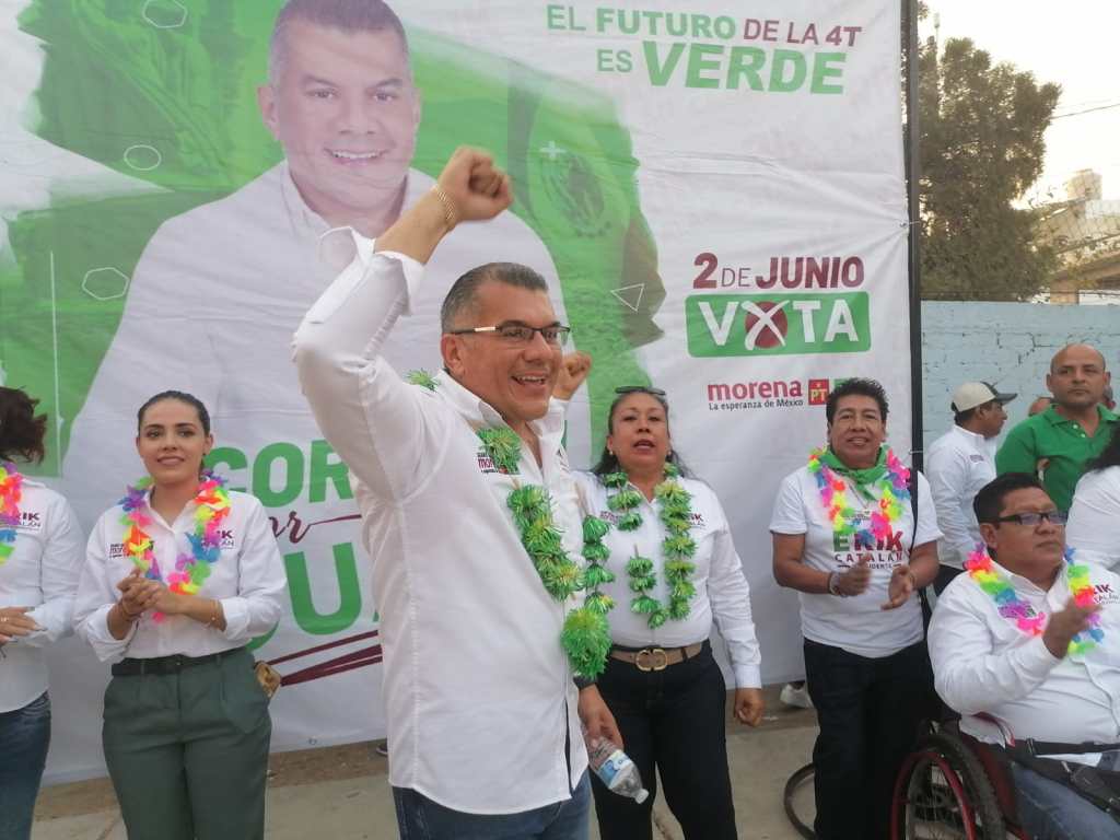 Erik Catalán, Candidato a Presidente Municipal de Iguala, de la coalición Morena-Verde-PT, fue recibido hoy por decenas de habitantes de las colonias Tamarindos y Juan N. Álvarez, ante quienes comprometió a generar empleos con mejores salarios y combatir la inseguridad con espacios deportivos y culturales, para alejar a los niños y jóvenes de los «malos pensamientos».