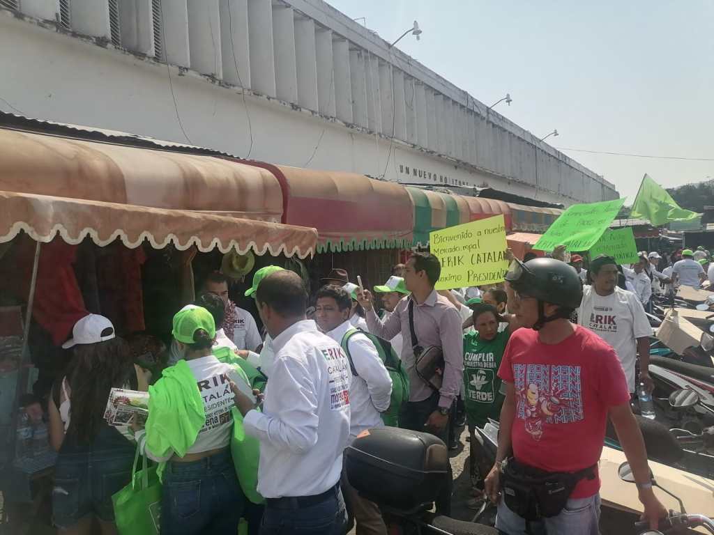 Después de su recorrido de más de tres horas en el interior del mercado municipal, se dirigió a las calles cercanas, como Galeana y Altamirano, donde choferes del transporte público y de vehículos particulares detenían su vehículo para que les colocarán propaganda de Erik Catalán y de la coalición Morena-Verde-PT.