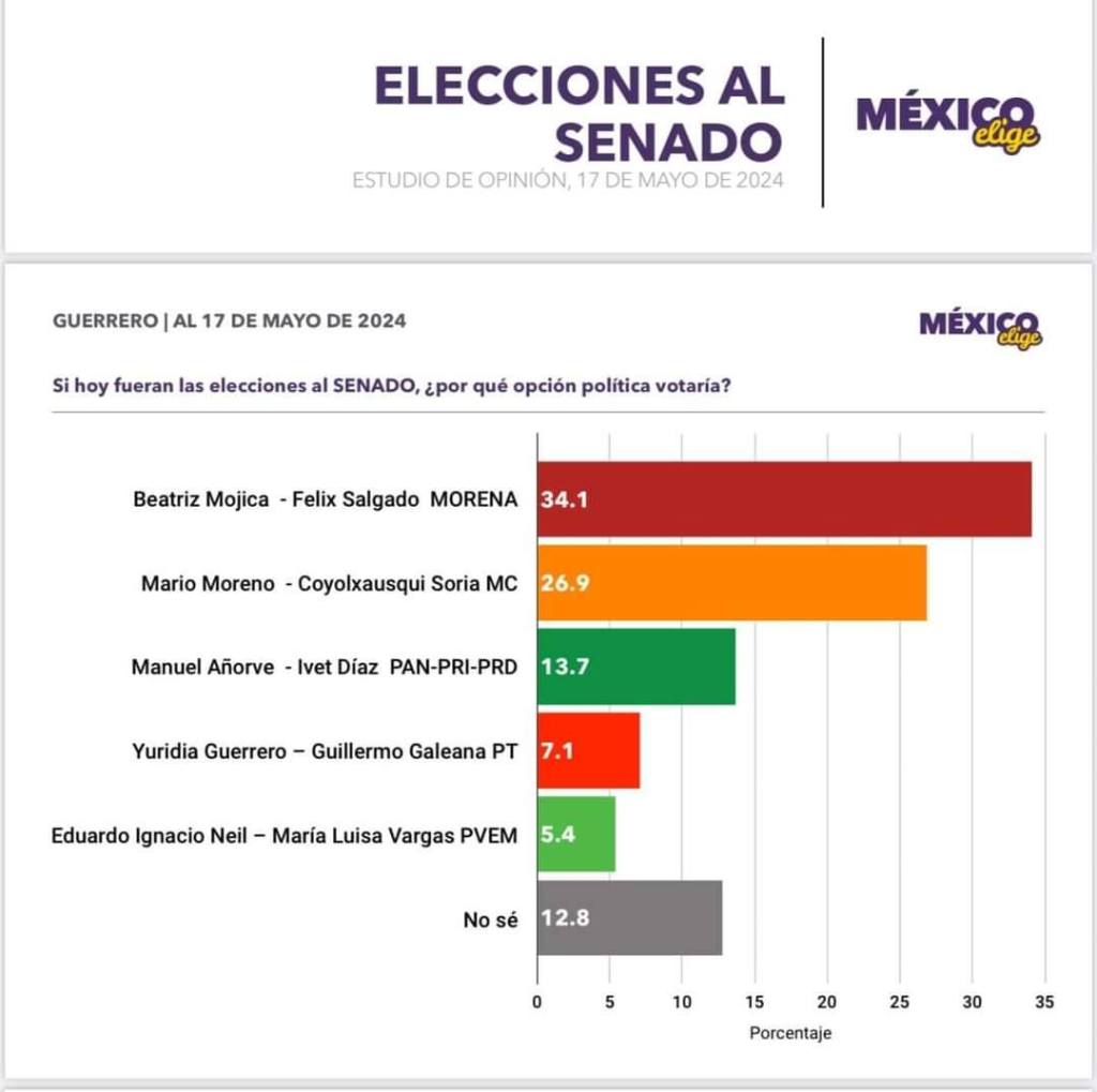 En su más reciente estudio de opinión, al 17 de mayo pasado, la empresa México Elige coloca a Beatriz Mojica y Félix Salgado con un 34.1 por ciento.