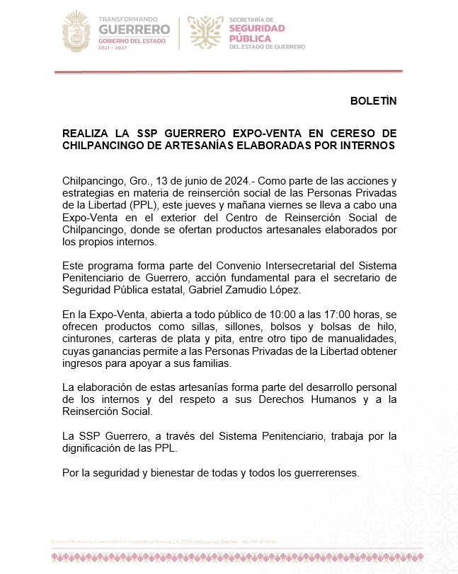 Chilpancingo, Gro., 13 de junio de 2024.- Como parte de las acciones y estrategias en materia de reinserción social de las Personas Privadas de la Libertad (PPL), este jueves y mañana viernes se lleva a cabo una Expo-Venta en el exterior del Centro de Reinserción Social de Chilpancingo, donde se ofertan productos artesanales elaborados por los propios internos.