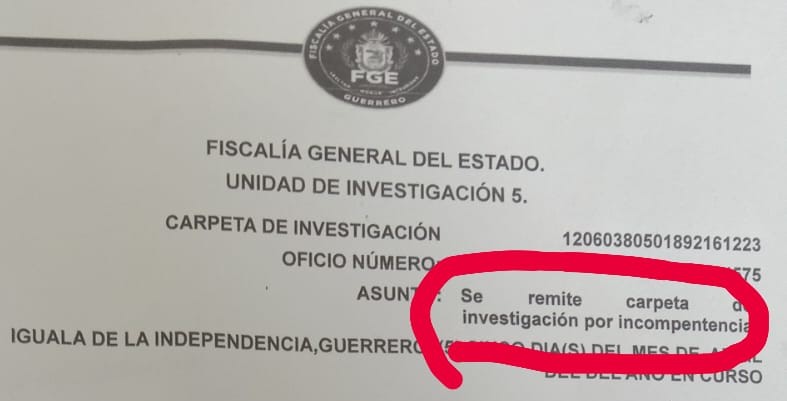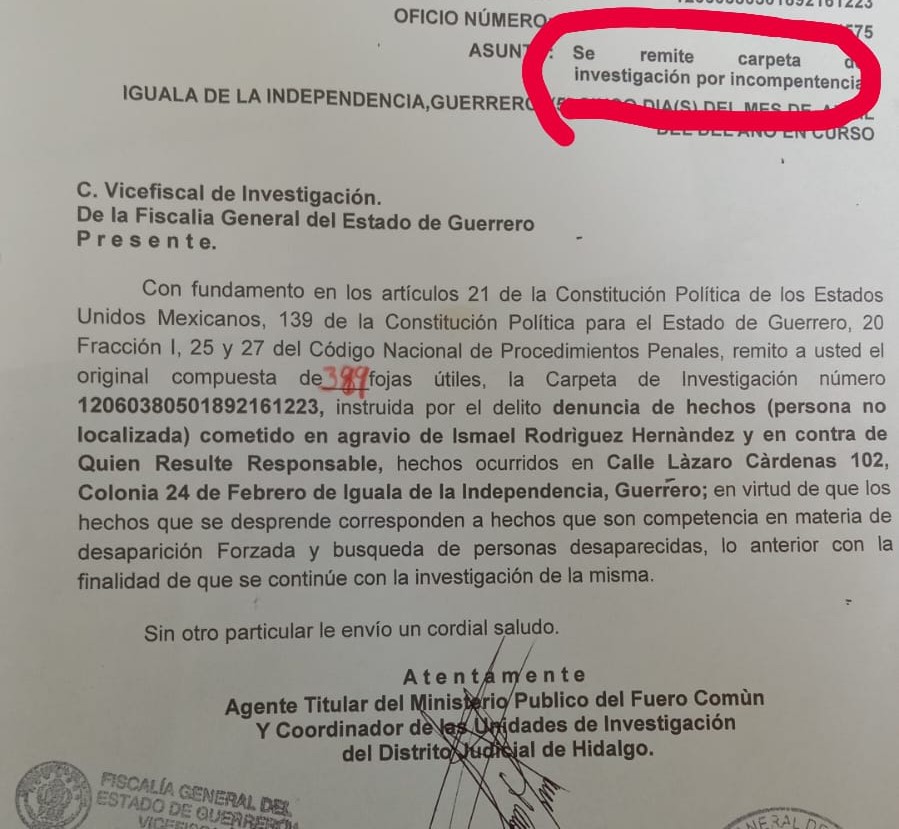 La oficina zona norte de la dependencia, entregó a la familia el oficio número 4575 con acuse de recibido el 5 de abril del 2024 en el que establecen como asunto de “incompetencia” para dar seguimiento al caso cuando la propia dependencia emitió la ficha de búsqueda a través del mecanismo “¿Has visto a..?