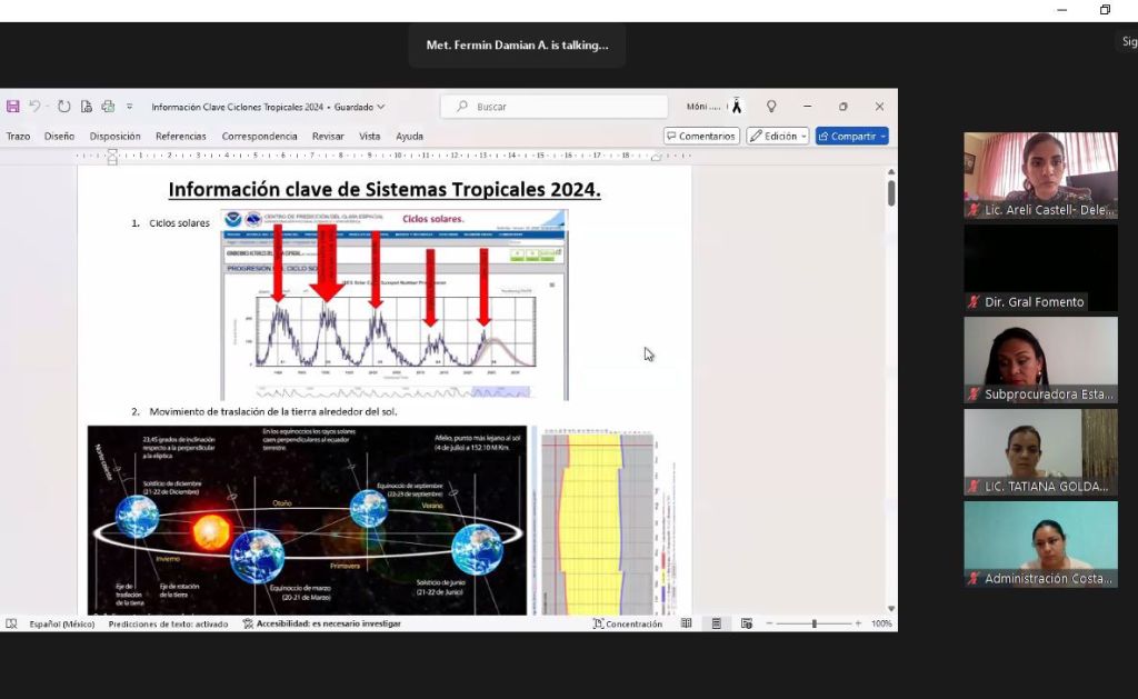 Esta actividad se desarrolló en la modalidad virtual y fue impartida por el meteorólogo de la SGIRPCGRO, Fermín Damián Adame, quien ofreció un amplio panorama de conceptos básicos de meteorología y dio a conocer el pronóstico de la actual temporada de lluvias y ciclones tropicales 2024, además de dar conocer los principales protocolos de actuación en caso de amenaza por ciclón tropical.