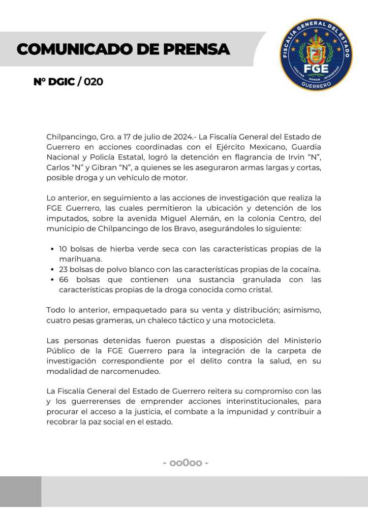Chilpancingo, Gro. a 17 de julio de 2024.- La Fiscalía General del Estado de Guerrero en acciones coordinadas con el Ejército Mexicano, Guardia Nacional y Policía Estatal, logró la detención en flagrancia de Irvin “N”, Carlos “N” y Gibran “N”, a quienes se les aseguraron armas largas y cortas, posible droga y un vehículo de motor.