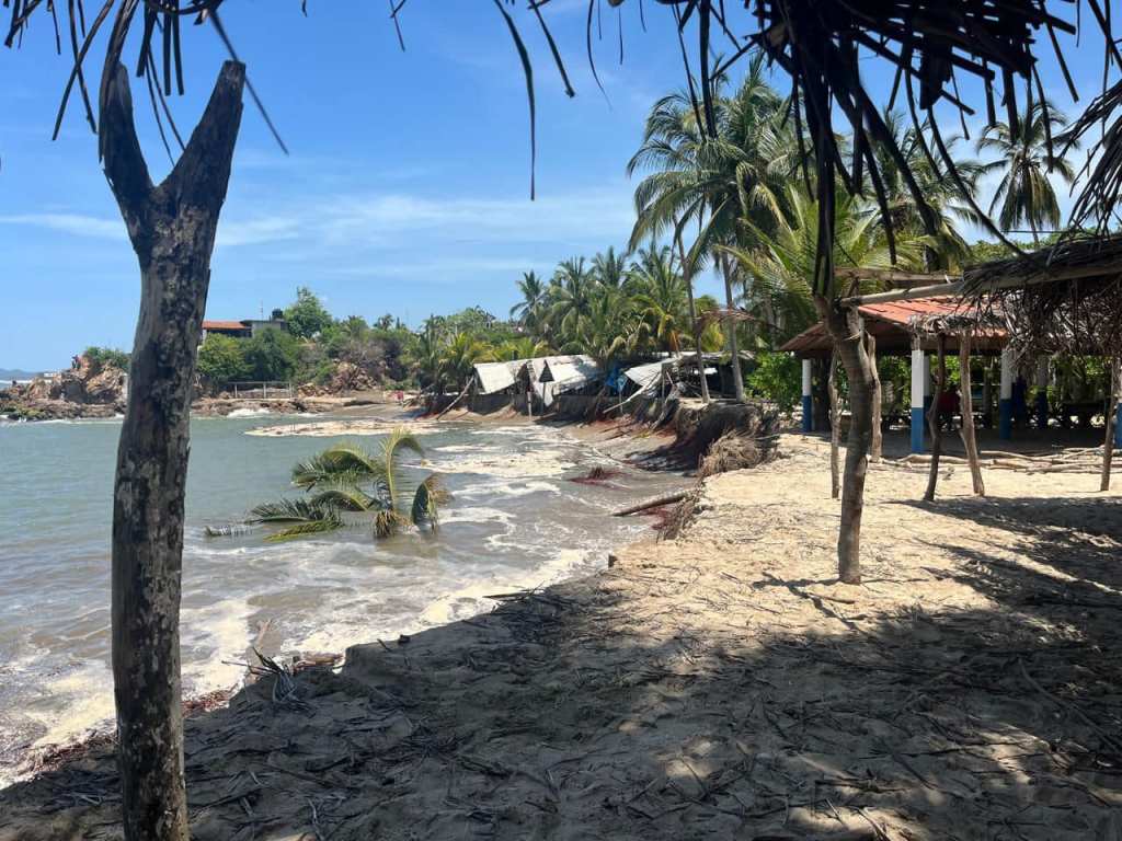 En compañía del comisario del lugar, Jesús Panchi Nandi, la coordinadora de la SGIRPCGRO en la región Costa Chica, Yazmín Hernández Villanueva, se pudo constatar la manifestación de olas de hasta 2.5 metros de altura, que han afectado la zona de playa con el arrastre de arena, causando daños en palmeras, enramadas y cabañas, sin reporte de víctimas y solo daños materiales.