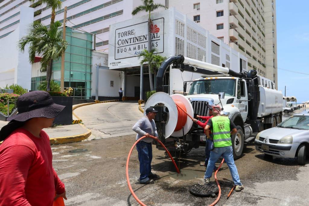 Por su parte, la Comisión de Agua Potable, Alcantarillado y Saneamiento del Estado de Guerrero (CAPASEG), realiza labores de desazolve de alcantarillas centrales de la Costera Miguel Alemán, así como en el acceso de playa Juan Serrano, localizado entre los hoteles Playa Suites y Emporio, en donde se reportó un vertimiento de aguas negras.