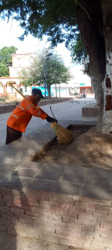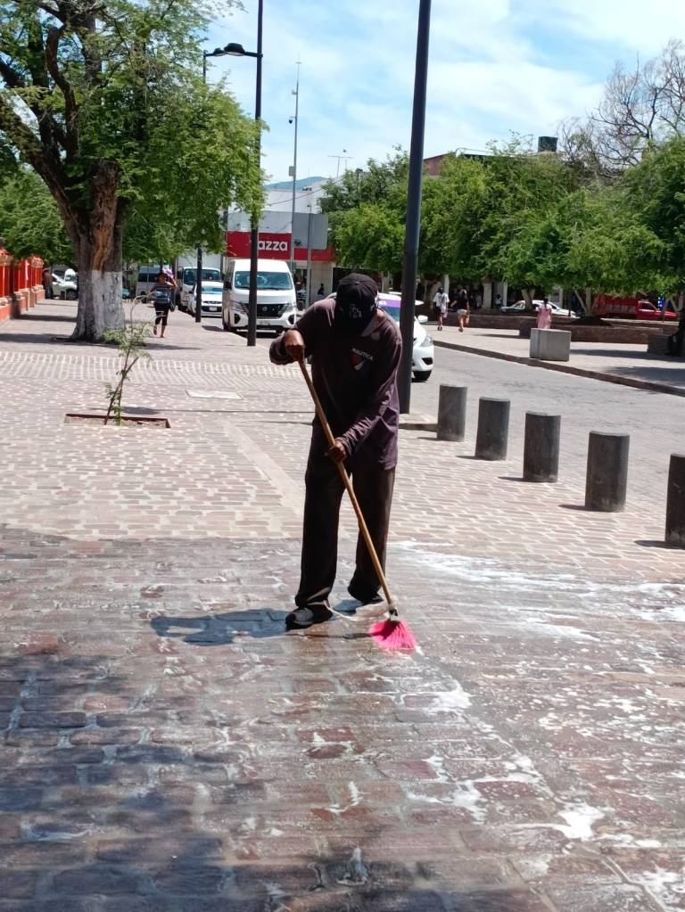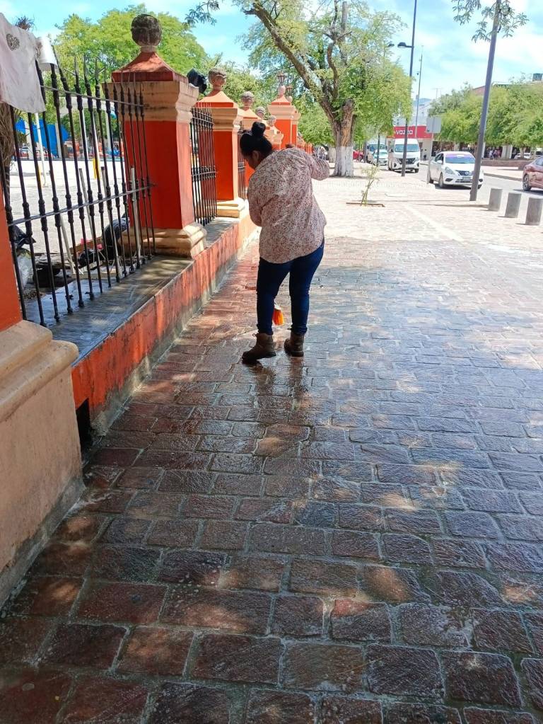 Iguala, Gro., julio 29.- Por instrucciones del presidente municipal de Iguala, David Gama Pérez, el secretario de los Servicios Públicos Municipales, Rubén Torres Olguín y el director de Limpia, Juan Donaldo Ramírez Sánchez, realizaron trabajos de coordinación de limpieza y lavado en el Zócalo, con la finalidad de que la ciudad se mantenga guapa.