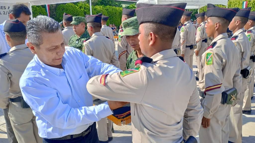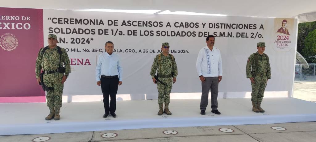 Iguala, Gro., julio 26.- A invitación de la Secretaría de la Defensa Nacional (SEDENA) y con la representación del presidente municipal de Iguala, David Gama Pérez, el síndico procurador Óscar Díaz Bello participó en la entrega de Ascensos a Cabos y Distinciones a Soldados de 1/a de los Soldados del Servicio Mexicano Nacional del 2/o. del E / N 2024.