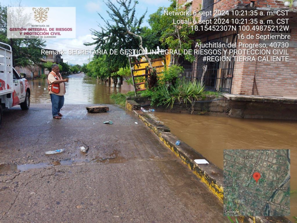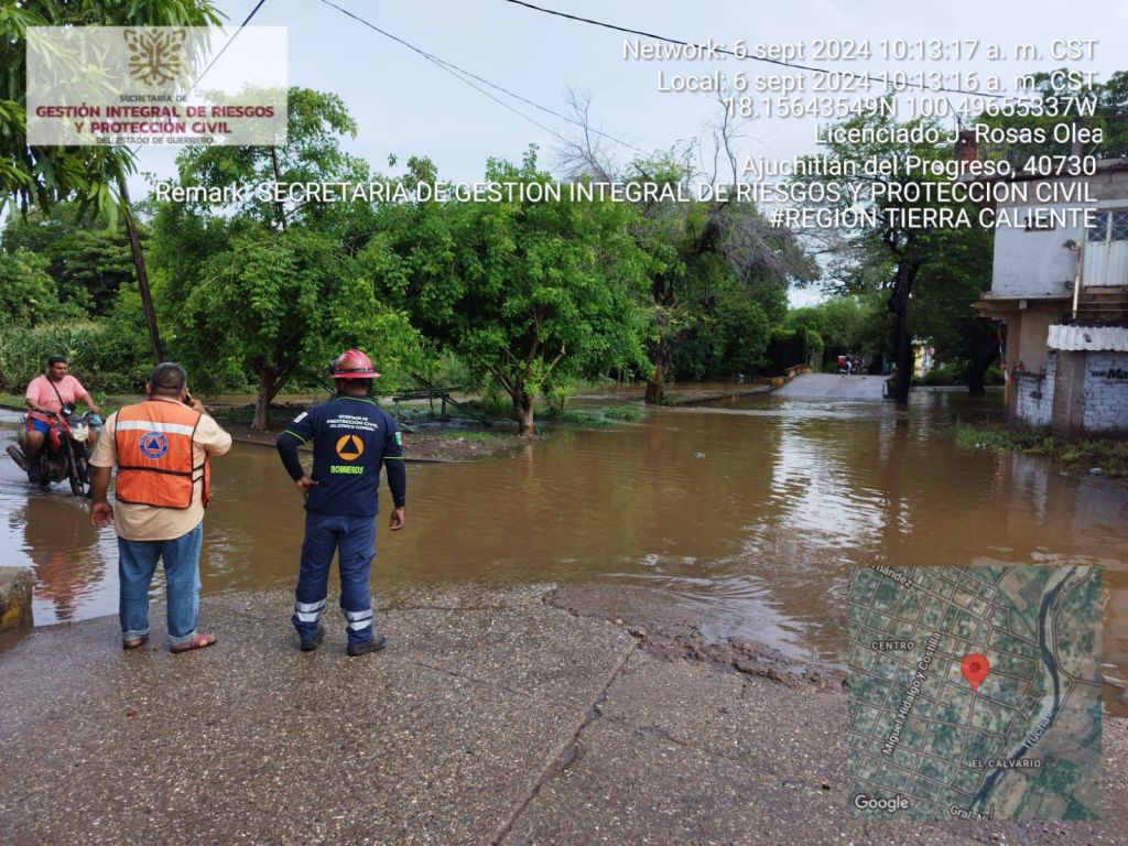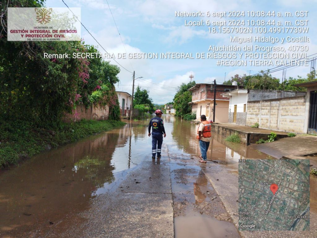 Chilpancingo, Gro., 06 de septiembre de 2024.- Por indicaciones de la gobernadora, Evelyn Salgado Pineda, personal operativo de la Secretaría de Gestión Integral de Riesgos y Protección Civil en la región #TierraCaliente, atiende las afectaciones registradas durante la madrugada de este viernes en la cabecera del municipio de Ajuchitlán del Progreso, derivado del desbordamiento del arroyo Las Truchas a causa de las últimas lluvias registradas.