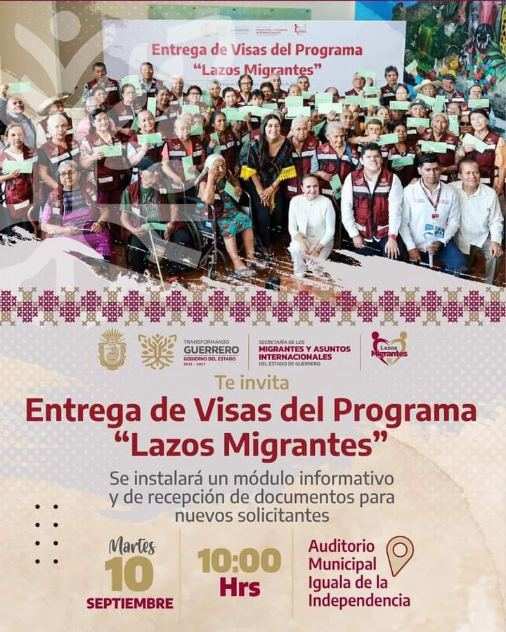 El Delegado de Gobierno de la Región Norte, Capt. Rodolfo Jesús Martínez Menez, les hace la más atenta invitación para que asistan a la «Entrega de Visas del Programa Lazos Migrantes», evento que tendrá lugar el próximo martes 10 de Septiembre del presente año a las 11:00 horas en el Auditorio Municipal de Iguala de la Independencia.