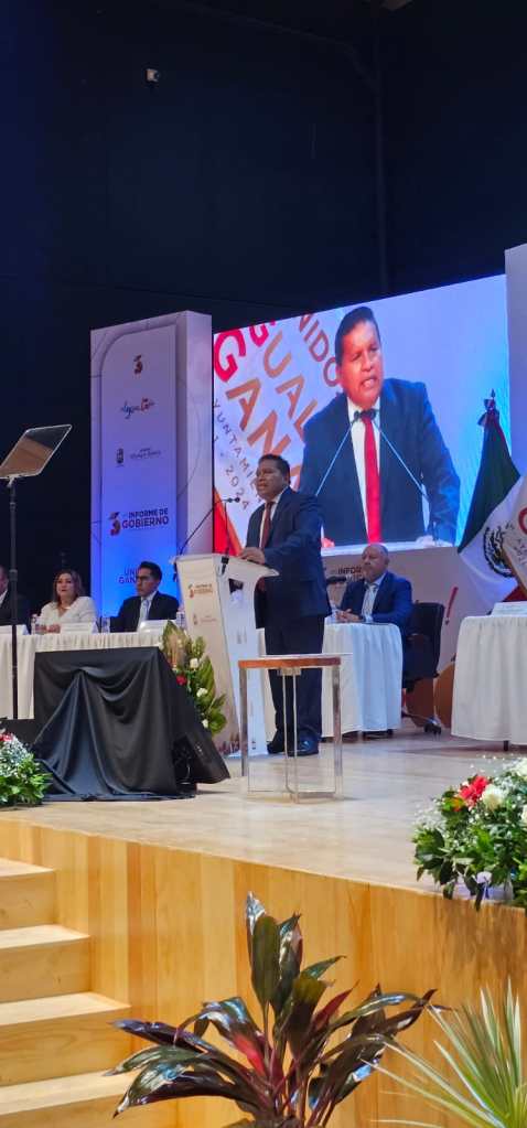 Ante un auditorio municipal lleno y arropado por el pleno de su Cabildo, el representante de la gobernadora, Evelyn Cecia Salgado Pineda, el Secretario de Contraloría y Transparencia gubernamental, Víctor Edgar Arenas y la representante del Congreso Local, diputada Pilar Vadillo, invitados especiales, familiares, amigos, David Gama Pérez, entregó la glosa a la síndica administradora, Nayeli Salmerón Mora, para que remita el contenido a las autoridades correspondientes y con ello cumplir con el requisito de rendición de cuentas y transparencia.