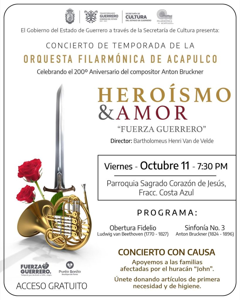 El Gobierno del Estado de Guerrero a través de la Secretaría de Cultura y la Orquesta Filarmónica de Acapulco, invitan al Concierto con Causa: «Heroísmo y Amor», ofrecido por la OFA bajo la dirección de Bartholomeus-Henri Van De Velde.