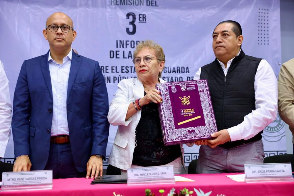 En tiempo y forma, conforme a lo dispuesto en el Artículo 73 de la Constitución Política del Estado de Guerrero, la encargada de despacho de la Secretaría General de Gobierno, Anacleta López Vega, entregó a nombre de la titular del Poder Ejecutivo, el Tercer Informe de Gobierno de Evelyn Salgado Pineda a las y los diputados que integran la Mesa Directiva y la Junta de Coordinación Política del Congreso del Estado.