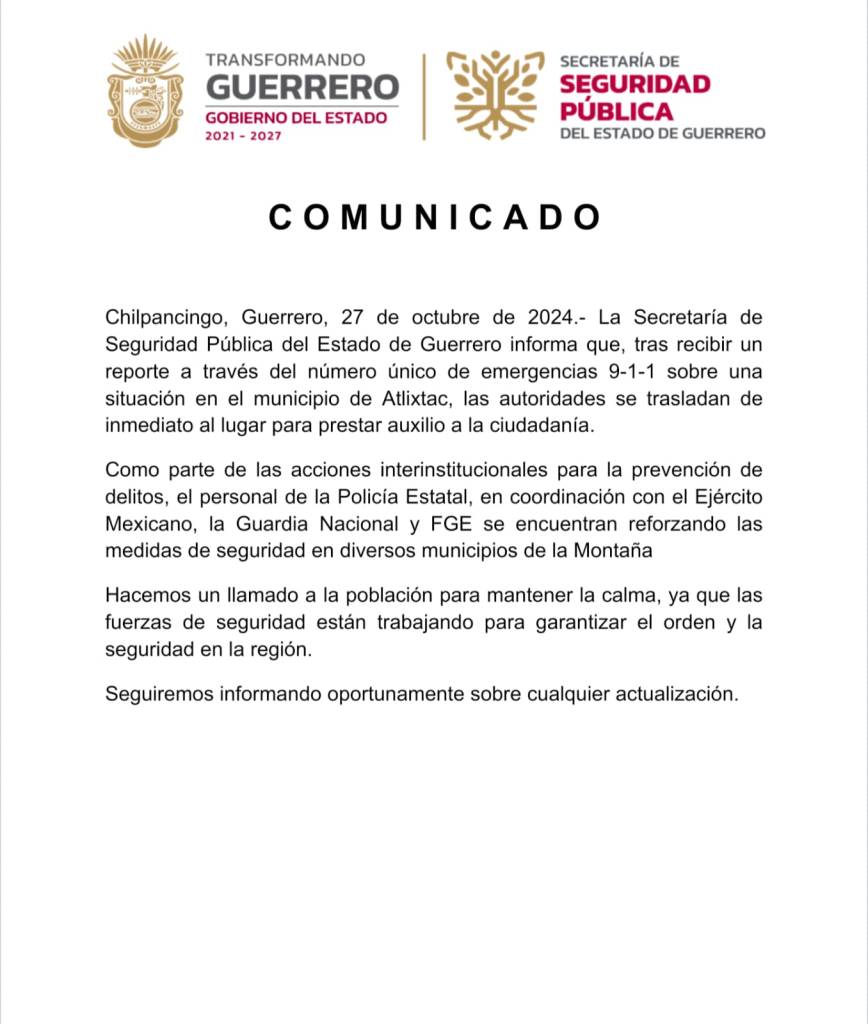 Chilpancingo, Guerrero, 27 de octubre de 2024.- La Secretaría de Seguridad Pública del Estado de Guerrero informa que, tras recibir un reporte a través del número único de emergencias 9-1-1 sobre una situación en el municipio de Atlixtac, las autoridades se trasladan de inmediato al lugar para prestar auxilio a la ciudadanía.
