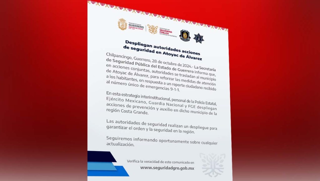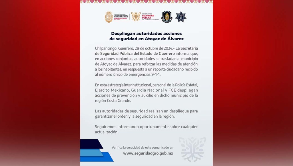Chilpancingo, Guerrero, 28 de octubre de 2024.- La Secretaría de Seguridad Pública del Estado de Guerrero informa que, en acciones conjuntas, autoridades se trasladan al municipio de Atoyac de Álvarez, para reforzar las medidas de atención a los habitantes, en respuesta a un reporte ciudadano recibido al número único de emergencias 9-1-1.