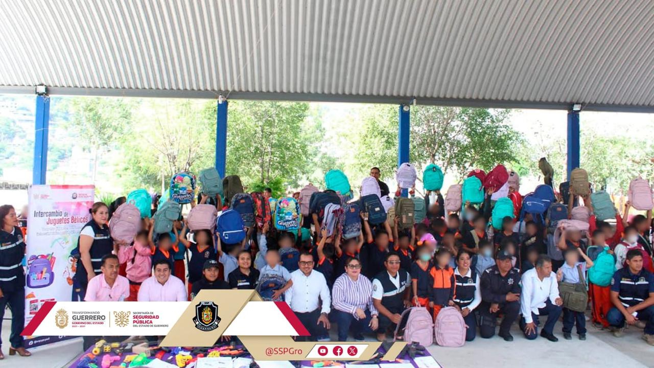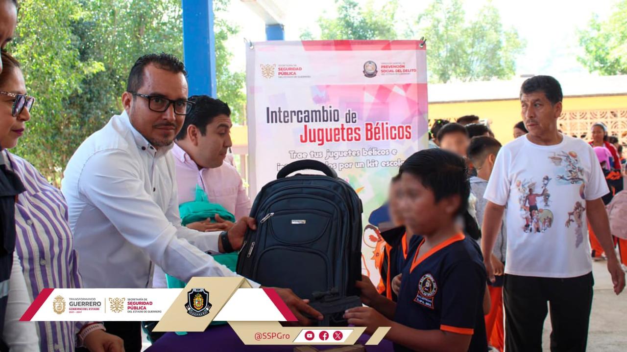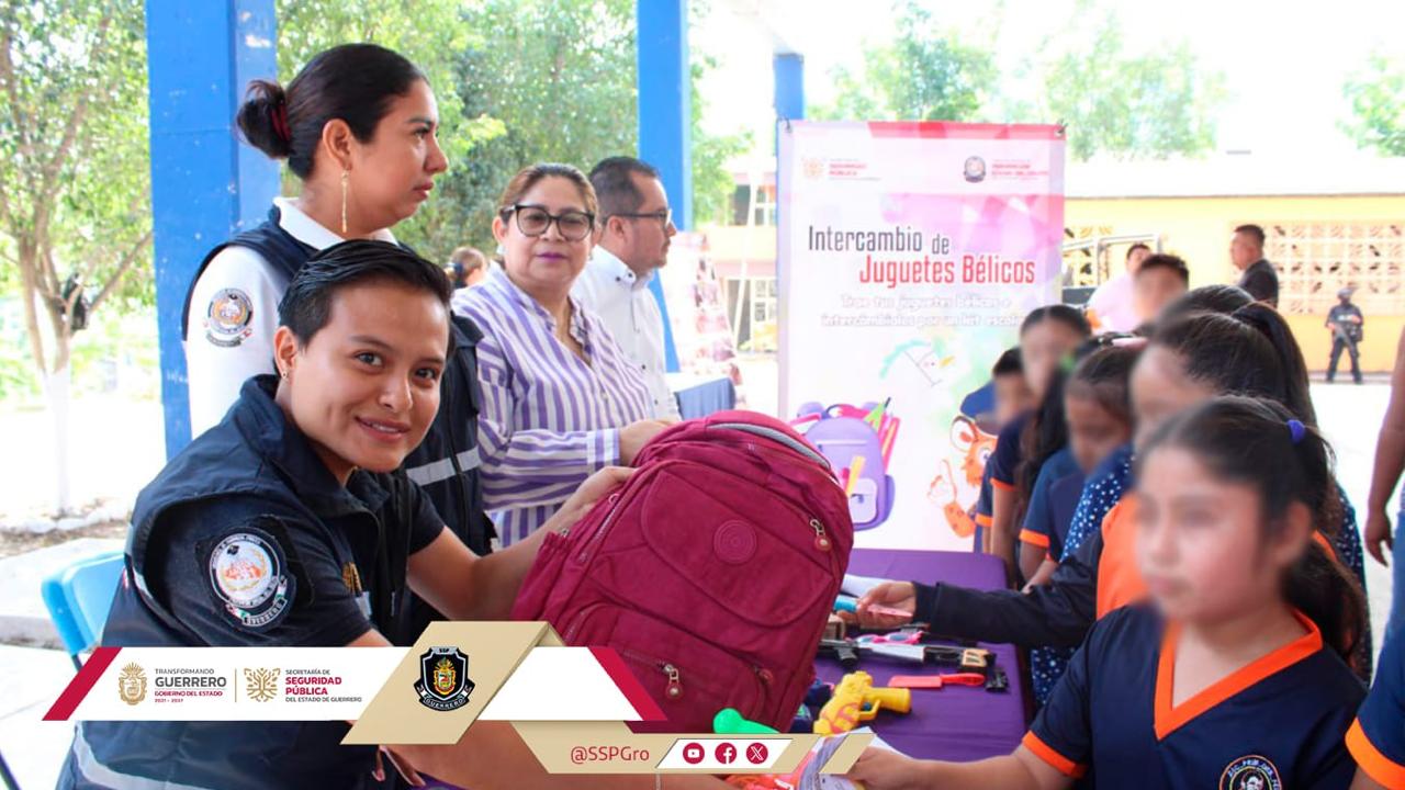 Además, a fin de dar cumpliendo con los programas con prioridad nacional del FASP 2024, se entregó un equipo de cómputo a la Primaria Nicolás Bravo y se realizó el intercambio de juguetes bélicos por kits escolares.