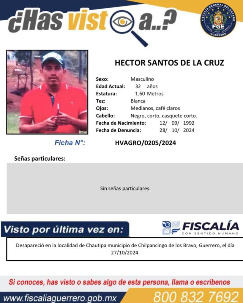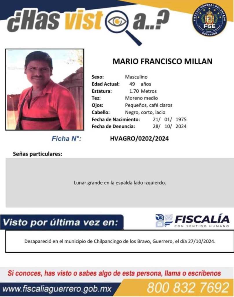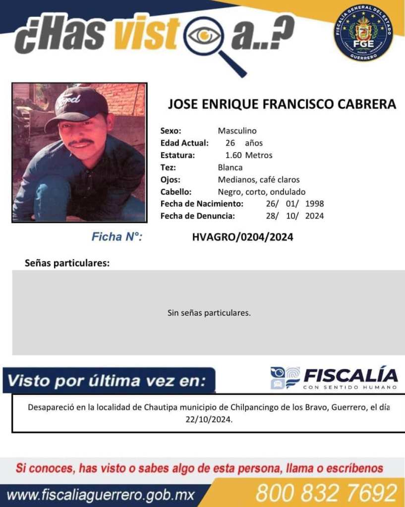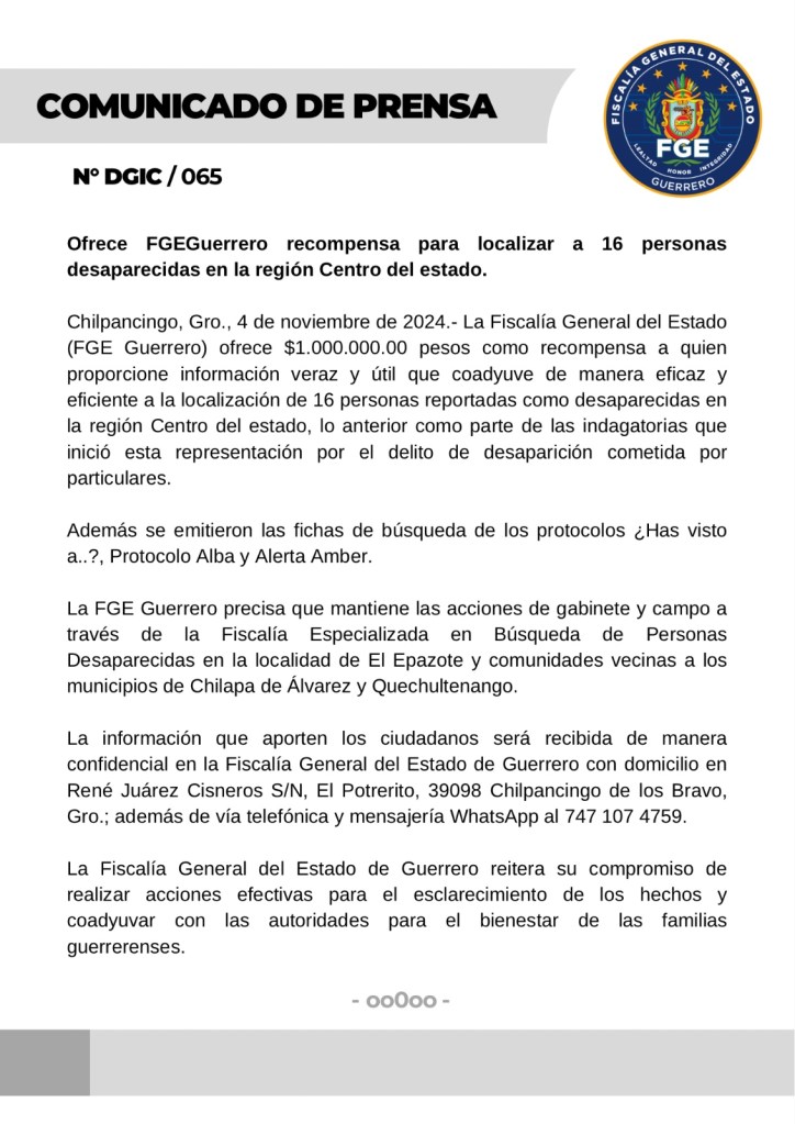 Chilpancingo, Gro., 4 de noviembre de 2024.- La Fiscalía General del Estado (FGE Guerrero) ofrece $1.000.000.00 pesos como recompensa a quien proporcione información veraz y útil que coadyuve de manera eficaz y eficiente a la localización de 16 personas reportadas como desaparecidas en la región Centro del estado, lo anterior como parte de las indagatorias que inició esta representación por el delito de desaparición cometida por particulares.