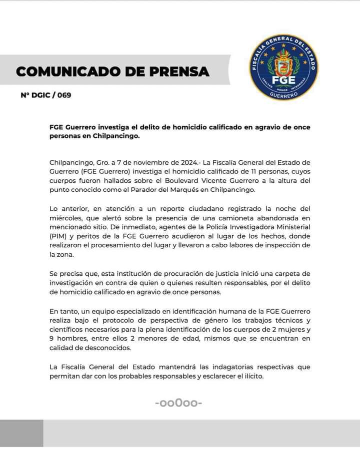 Chilpancingo, Gro. a 7 de noviembre de 2024.- La Fiscalía General del Estado de Guerrero (FGE Guerrero) investiga el homicidio calificado de 11 personas, cuyos cuerpos fueron hallados sobre el Boulevard Vicente Guerrero a la altura del punto conocido como el Parador del Marqués en Chilpancingo.