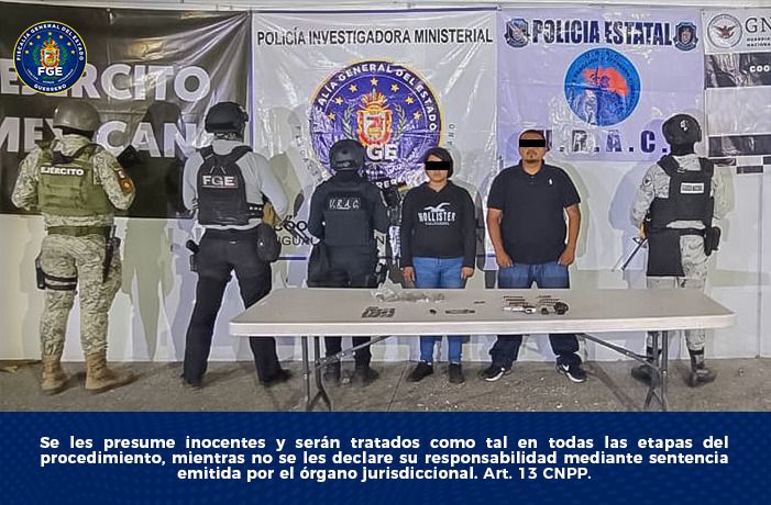 La FGE Guerrero, Ejército Mexicano y Guardia Nacional detienen a un hombre y una mujer y les aseguran armamento en Buenavista de Cuéllar.