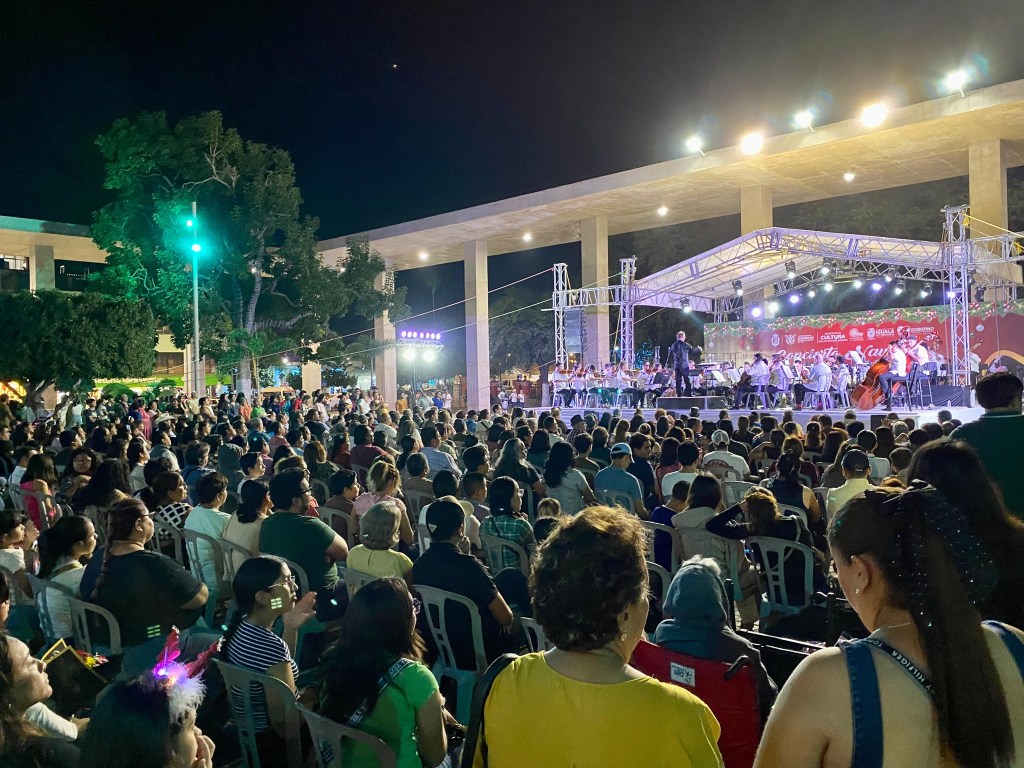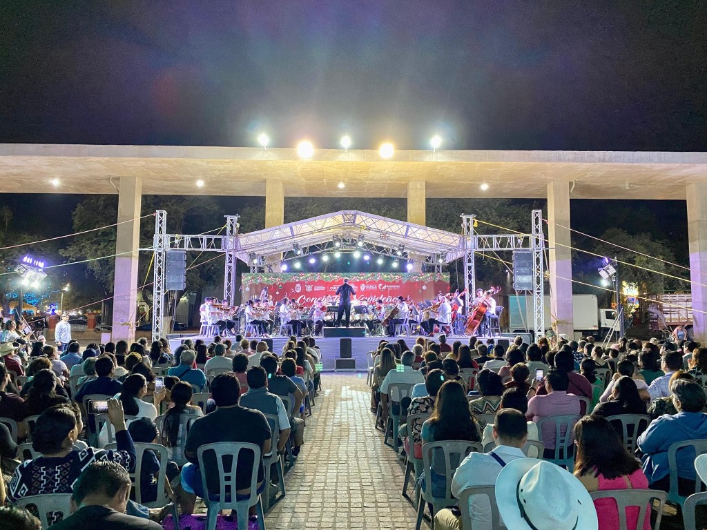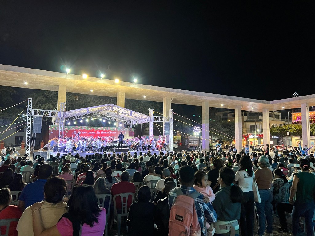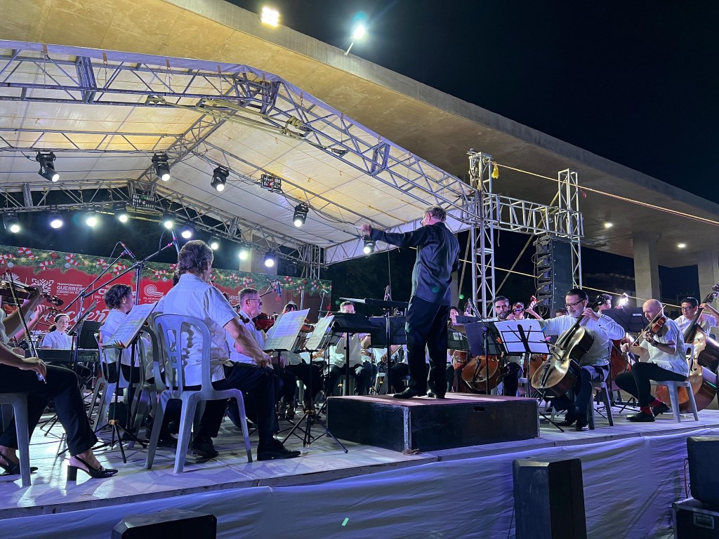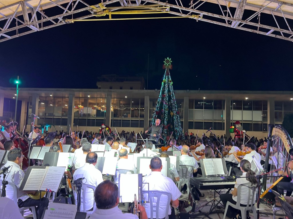 Iguala, Gro., 8 de diciembre del 2024.- Con el apoyo de la Gobernadora Evelyn Salgado Pineda y en una coordinación estrecha entre la Secretaría de Cultura Guerrero y el Gobierno Municipal de Iguala de la Independencia, la Orquesta Filarmónica de Acapulco, dirigida por el Maestro Bartholomeus Henri Van de Velde, presentó la noche de este sábado el Concierto Especial de Navidad en la Explanada de las Tres Garantías, donde se reunieron un promedio de mil personas para participar en el viaje musical que ha recorrido ya municipios, parroquias, instituciones educativas y centros de rehabilitación en esta época decembrina.