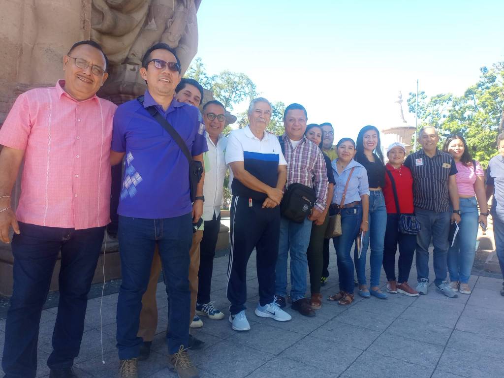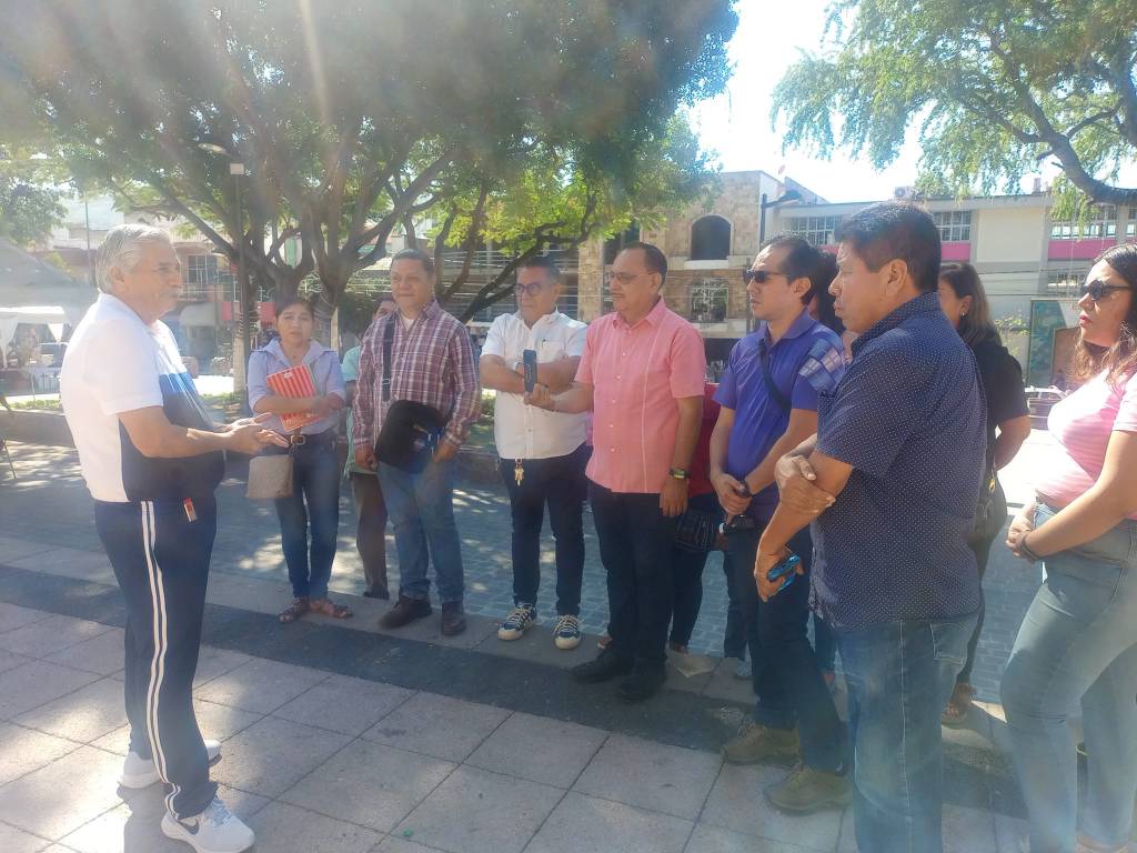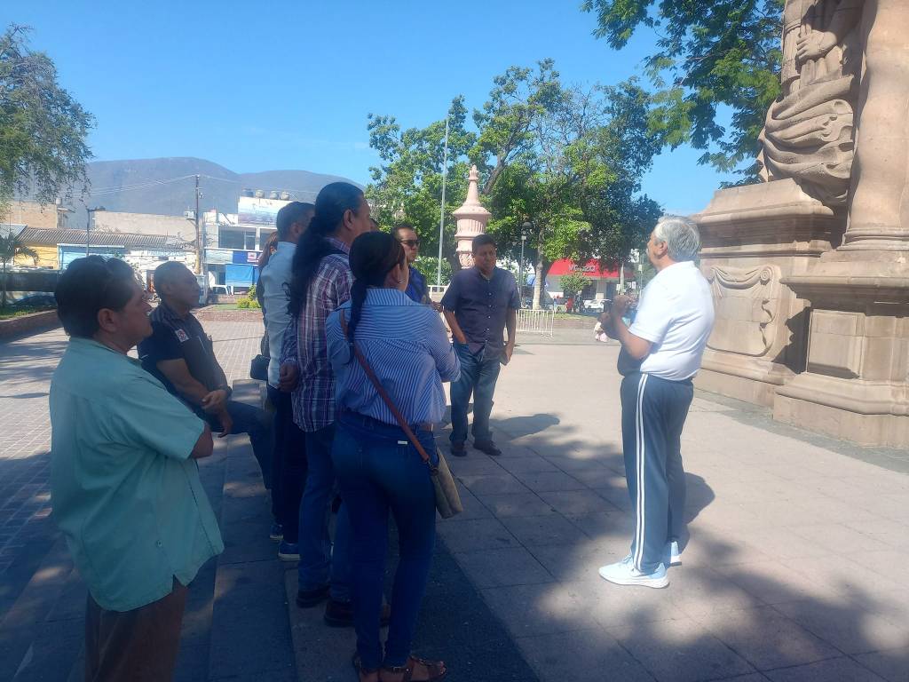 Recibiendo sus clases de » La enseñanza de la historia de Iguala» en la práctica en plena plaza del monumento, encontramos a un grupo de compañeros periodistas entre estos Frank Lara y Julio Palacios, al director del Museo de la Bandera, Héctor Ceballos Hipólito, entre otros no menos importantes conocidos en nuestra sociedad.