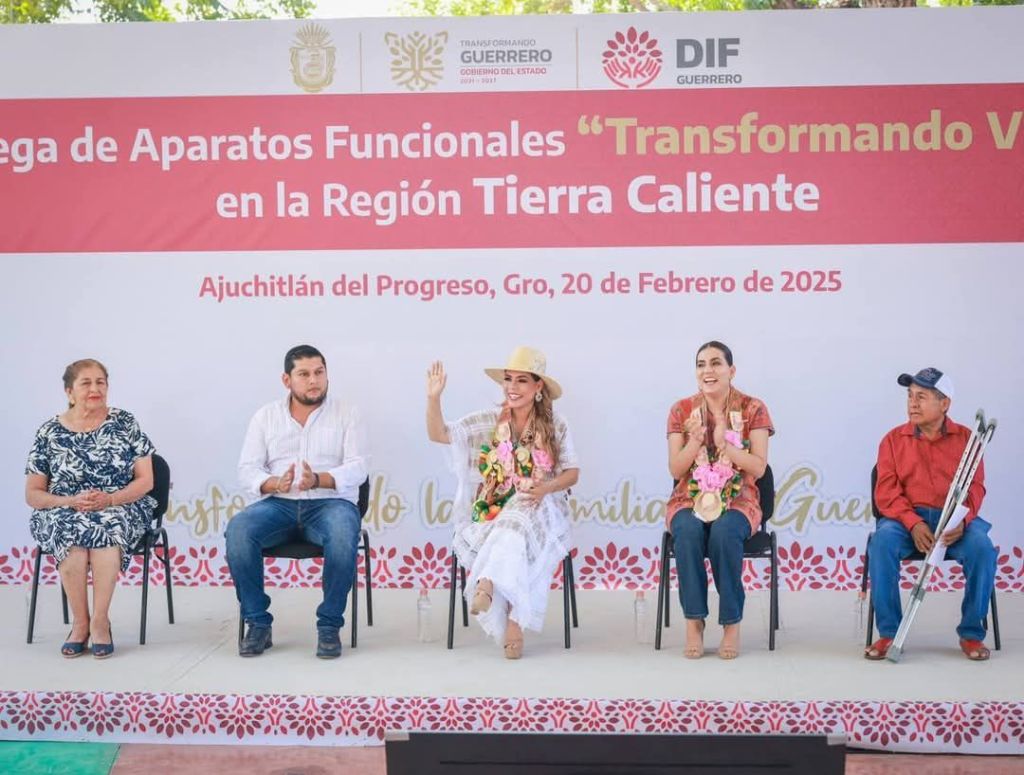 La mandataria estatal visitó el municipio de Ajuchitlán del Progreso donde, junto con la presidenta del Sistema DIF Guerrero, Liz Salgado Pineda, hizo entrega de aparatos funcionales como sillas de ruedas, muletas, andaderas, bastones, todo esto correspondiente al mes de febrero del programa «Transformando Vidas» a personas con discapacidad beneficiarias de la región.