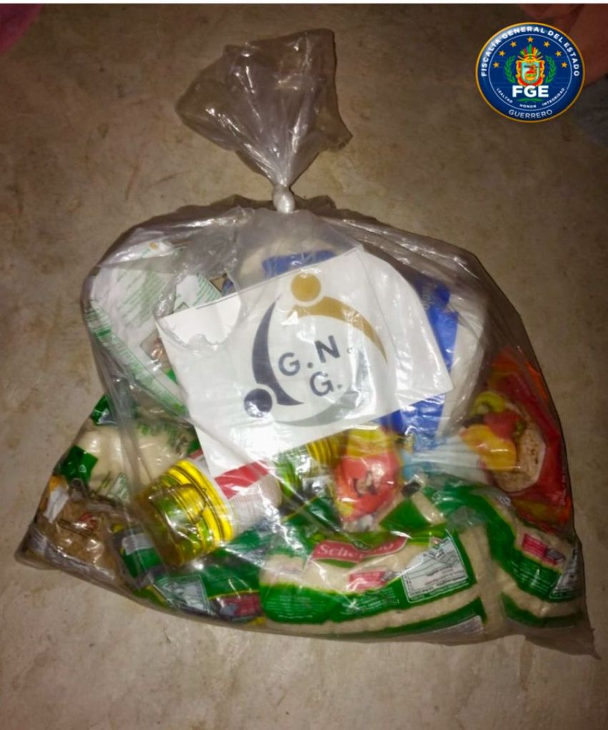 Asimismo, se localizó una bolsa de plástico que contenía productos de la canasta básica. Esta bolsa portaba una calcomanía adherida con las siglas “G.N.G.”, las cuales hacen alusión a un grupo delictivo que opera en la zona y podrían interpretarse como apología del delito.