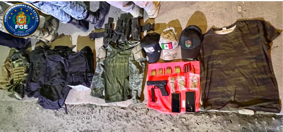 En operativo interinstitucional, #FGEGuerrero, Defensa, GN, SSyPC y SSPgro, aseguran una réplica de arma corta, cartuchos, equipo táctico y presunta droga.