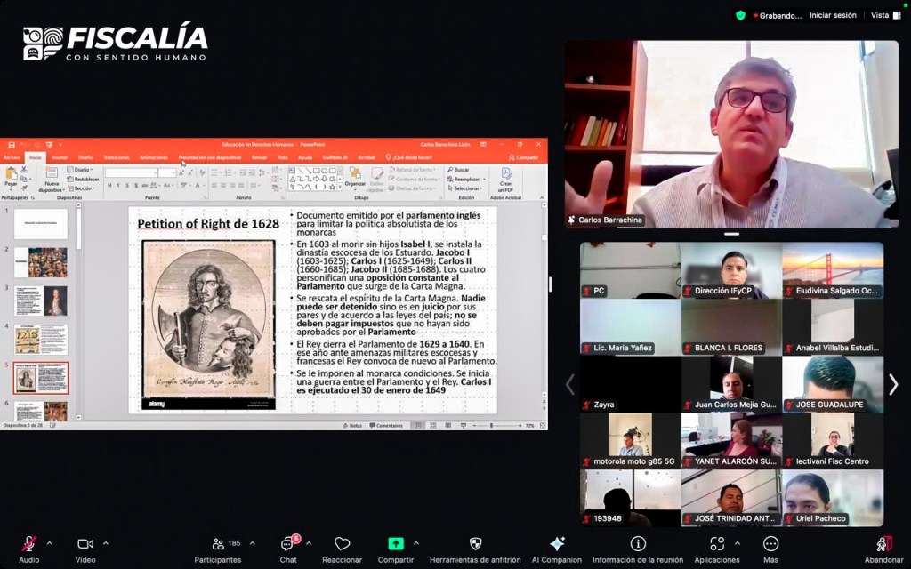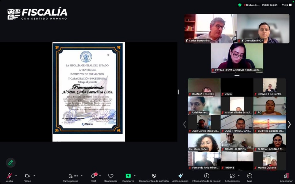 Chilpancingo, Gro., a 23 de marzo de 2025. – La Fiscalía General del Estado de Guerrero, a través del Instituto de Formación y Capacitación Profesional, llevó a cabo la conferencia virtual titulada “Mecanismos Judiciales de Protección de los Derechos Humanos”, dirigida a servidores públicos de la FGE y al público en general mediante la plataforma Zoom.