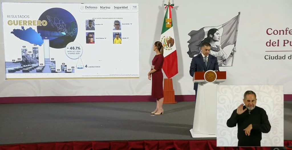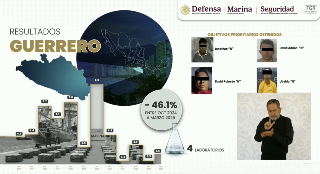 Ciudad de México, 8 de abril de 2025. – El estado de Guerrero registró una reducción del 46.1% en homicidios dolosos en los últimos seis meses, derivado de detenciones de objetivos generadores de violencia, operativos estratégicos y una coordinación con trabajo de inteligencia e investigación entre las fuerzas federales y estatales, destacó la presidenta Claudia Sheinbaum Pardo.