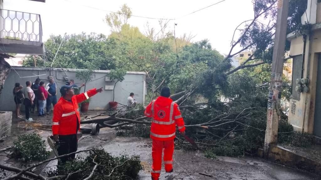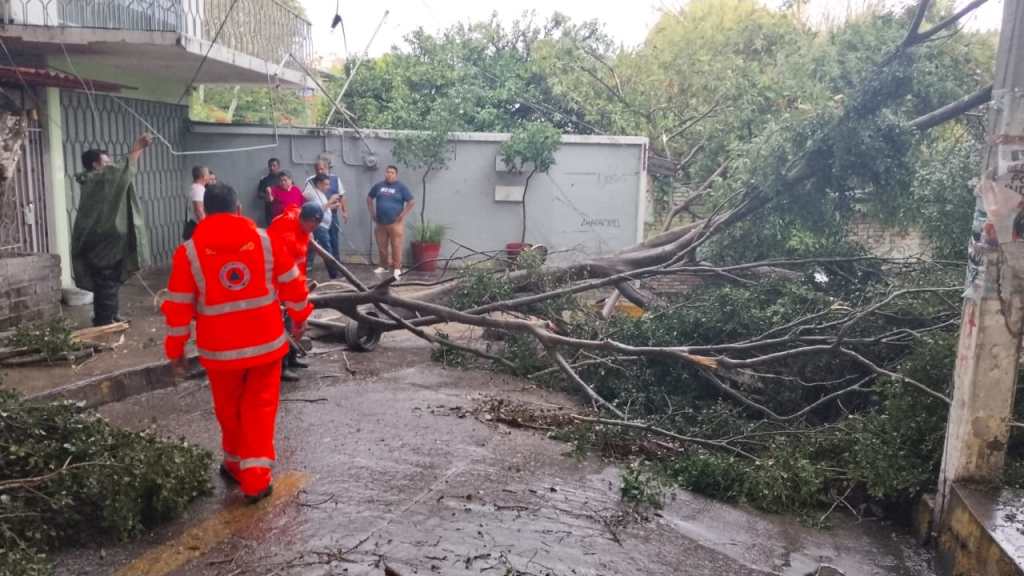 La precipitación, acompañada de fuertes rachas de viento y granizo provocó diversas afectaciones como la caída de árboles, colapsos de estructuras ligeras y encharcamientos en vías de comunicación. De manera coordinada, personal operativo de esta Secretaría, en conjunto con autoridades municipales, se desplegó para atender las emergencias reportadas en distintas colonias de la capital.